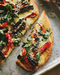 Depending on the size of the appetites around your house, this substantial pizza with its meaty portobello mushrooms serves two very hungry people or four if it's accompanied by a big salad. If you don't have fresh basil, stir some pesto into the peppers and mushrooms before putting them on the pizza