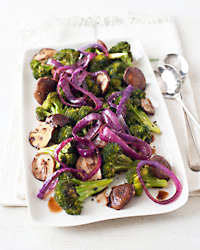 Preheat the oven to 425°. Trim and peel the broccoli stems. Cut the broccoli lengthwise into long stalks, with 1 or 2 florets each. Cut any remaining florets into 2-inch pieces. Spread the broccoli on a large, rimmed baking sheet. On another large, rimmed baking sheet, put the shiitake on one side and the onion slices on the other. Generously brush all the vegetables with olive oil, season with salt and pepper and roast for about 20 minutes, until just tender and lightly browned. Transfer the broccoli to a platter. Drizzle the balsamic vinegar over the mushrooms and onion rings and stir to coat the vegetables. Top the broccoli with the shiitake and onion and serve.