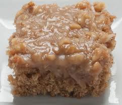 BAKE 350° for 30 minutes (cake may rise in center, just put in for a few more minutes). Mix together topping ingredients and spread on hot cake. Bake two minutes more.