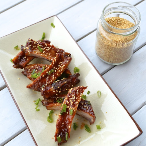Voltear las costilla y asar durante otros 45-60 minutos. Añadir agua a la bandeja para asar como el agua se seca durante el proceso de tostado. Si lo desea, puede acabar de hornear a temperatura más alta por algunos minutos hasta que empiezan a oscurecerse y caramelizar . Retire las costillas del horno y cortar en trozos . Para servir, espolvorear con semillas de sésamo y decorar con la cebolla de cambray , solo la parte verde.