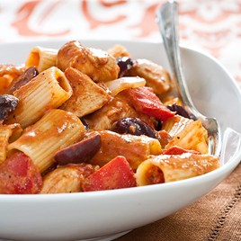A little onion contributed plenty of sweetness to our Chicken Riggies recipe, while garlic, dried oregano, and a hefty dose of grated Romano cheese gave the sauce real Italian flavor. A relatively conservative amount of heavy cream balanced the high-impact ingredients without turning the dish into a full-fledged cream sauce.