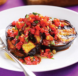 Grilled Eggplants with Roasted Red Pepper Relish with Pine Nuts, Currants, and Marjoram