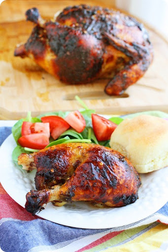 Roast until chicken is cooked through, 2 to 2 1/2 hours, or until chicken is cooked through and juices run clear, not pink. The temperatures should register 165-170°F for the breast and 180-185°F for the thigh. Transfer chicken to a large cutting board. Tent loosely with foil and let stand 10 minutes.