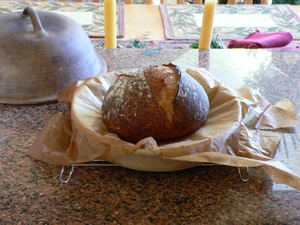3. About 30 min before baking, adjust oven rack to lowest position, place 6 to 8 quart Dutch oven (with lid) on rack, and heat oven to 500 degrees. Lightly flour top of dough and, using razor blade, make one 6 inch long, 1/2 inch deep slit along top of dough. Carefully remove pot from oven and remove lid. Pick up dough by lifting parchment overhang and lower into pot. Cover pot and place in oven. Reduce oven temperature 425F and bake covered for 30 minutes. Remove lid and continue to bake until the loaf is a deep brown and instant read thermometer inserted into center registers 210 degrees, 20 to 30 minutes longer. Carefully remove bread from pot, transfer to wire rack, and cool to room temperature, about 2 hours.