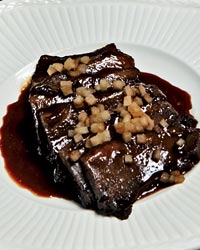Both Frank Falcinelli and Frank Castronovo had early experiences with sauerbraten, the German braised brisket. Castronovo sampled it on trips to Germany; Falcinelli had it at the German deli where he worked as a teenager. The terrific recipe they ultimately perfected is both very sweet and very sour, made with raisins, apples, red wine vinegar and red wine.