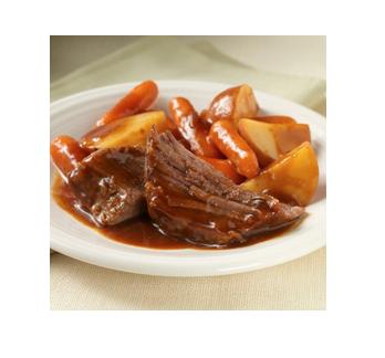 Remove roast to cutting board. With slotted spoon, remove vegetables and place in serving bowl. Cut roast. Serve meat and vegetables with sauce.