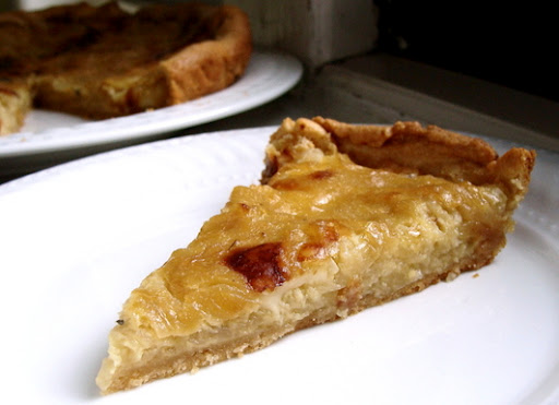6. To finish the filling, add the egg and cheese to the bowl with the onions. Stir to mix well. Pour mixture over the tart crust and spread to the edges using a rubber spatula. Bake for 25 minutes, until slightly puffed and golden. Remove from oven and let cool for 5 to 10 minutes before slicing.
