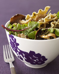 Add the broken lasagna noodles to the boiling water and cook until al dente. Drain the pasta, reserving 1/2 cup of the pasta cooking water. Return the drained pasta to the pot. Add the watercress and walnut pesto and toss well. Add the reserved pasta water and toss again until well coated. Transfer the pasta to bowls, garnish with the remaining 1/4 cup of cheese, the chopped walnuts and sautéed mushrooms and serve.