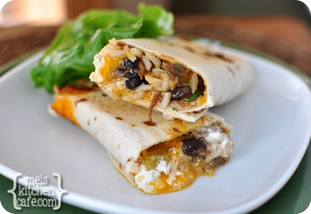 (Optional: I like to dollop little bits of sour cream over the cheese before arranging chicken and rice mixture down the center – it makes the wraps delightfully creamy.)