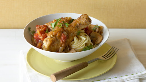 3. In same skillet, sauté onion and garlic for 3 minutes. Add tomatoes, mushrooms, 1⁄2 tsp salt, 1⁄4 tsp pepper, and oregano. Bring to a boil. Add chicken. Cover; simmer for 25 minutes or until done. Serve with linguine.
