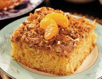 Combine mandarin oranges and egg in a medium bowl and mix well. Add to butter mixture and mix well. Spoon into prepared baking pan.