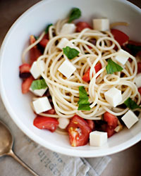 Spaghetti with Tomatoes, Basil, Olives, and Fresh Mozzarella