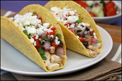 Divide chilled chicken between taco shells, and sprinkle with oregano. Top with lettuce mixture, followed by feta cheese.