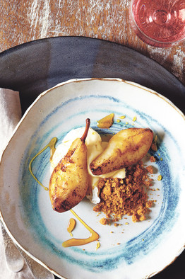 Set a small pan over medium heat. Once hot, add oil. Season pears with salt and pepper. Place pears, skin side up, in pan. Once surfaces of pears are caramelized, about 5 minutes, flip pears and add butter and thyme to pan. Cook pears, constantly basting with butter, until warmed through and just fork tender, about 4 minutes. Place one pear half over cheese on each plate.