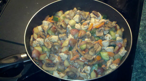 2. Next add mushrooms. Stir, cover about 5 minutes. Add carrots, zucchini & chicken (I add water after this step to help steam the veges and make some "juice"-about 1/2 cup or so, depending on how much the food soaks up). Stir well, cover.