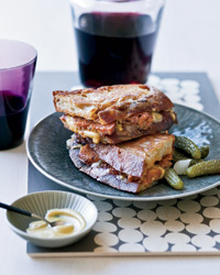 Place the sandwiches in the skillet, cover and cook over moderately low heat until golden on the bottom, 3 minutes. Press with a spatula to flatten slightly, then flip the sandwiches, cover and cook until browned on the bottom, 3 minutes longer; lower the heat if the bread is browned before the cheese melts completely. Transfer the sandwiches to a cutting board and let rest for 2 minutes, then cut them in half and serve with cornichons.