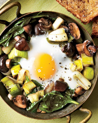 Coat four 1-cup ramekins or small gratin dishes with oil. Transfer the mushrooms and spinach to the ramekins and crack an egg on top of each. Bake for 10 to 12 minutes, until the white is barely set and the yolks are runny. Let stand for 2 minutes; serve with the toasts.