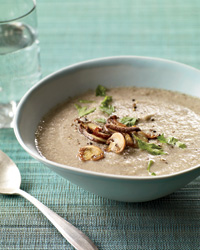 Working in batches, puree the soup in a blender until very smooth; return to the saucepan and whisk in the crème fraîche. Simmer for 2 minutes. Add the coriander and season with salt and pepper. Ladle the soup into bowls. Garnish with the sautéed mushrooms and chervil and serve.