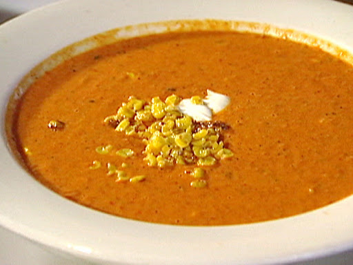 Cream of Roasted Red Bell Pepper Soup with Roasted Sweet Corn and Cilantro- Lime Sour Cream