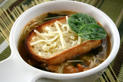 Excellent soup! This was very easy to make but packed with flavour. A definite make again recipe. I used lean hot Italian sausage, decreased the amount of spinach and increased the amount of capellini. Teenagers loved it! I used a pre-shredded Italian cheese mix instead of just Parmesan, and next time I think I'll use even more cheese and broil for a couple of minutes to fully melt the cheese. Great recipe