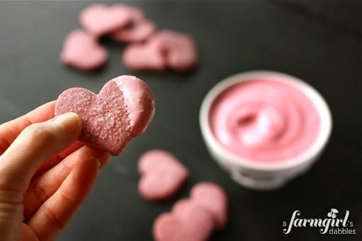 In the bowl of a stand mixer, beat butter and sugar until the mixture is a bit fluffy. Add in the flour and mix until incorporated. Add the cooled 1/4 cup of raspberry sauce and mix until dough is evenly colored.