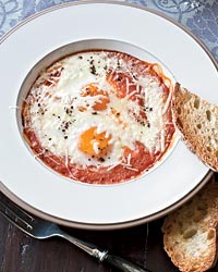 Set 4 shallow ovenproof bowls on a baking sheet. Strain the pureed sauce into the bowls, pressing on the solids. Crack 2 eggs into each bowl and season with salt and pepper. Sprinkle the cheese over the eggs and bake the eggs for about 15 minutes, until the whites are just set. Serve hot.