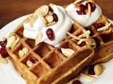 Cook the waffles: Preheat a waffle iron and grease it if it's not nonstick. Spoon in the batter and cook until golden brown. Keep warm in a 250 degree F oven (directly on the rack) until serving. Serve with whipped cream, if desired, and sprinkle with the topping.