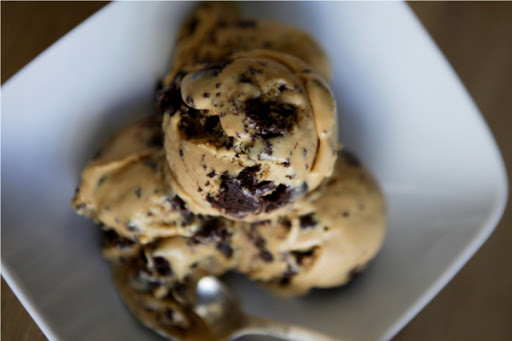 When the ice cream has finished churning, fold in the "Nutella" coated brownie chunks, transfer to a container and freeze.