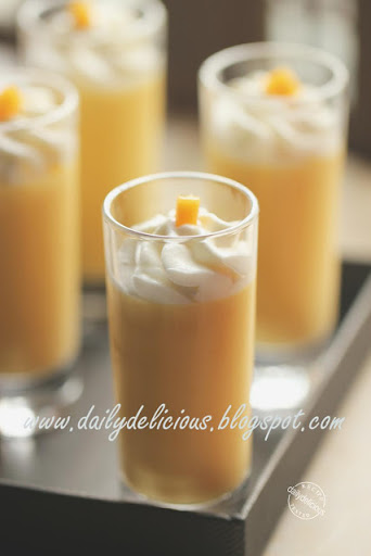 Whip the whipping cream until soft peak form, then pipe it over the pudding and decorate with mango pieces.