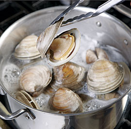 Put 2 cups of water in a heavy-duty 6- to 7-quart pot or Dutch oven, cover, and bring to a boil over high heat. Add the clams and cook, covered, for 5 minutes (if the liquid threatens to boil over, set the lid ajar and reduce the heat slightly). Remove the lid, stir, and as the clams pop open completely, transfer them with tongs to a large bowl. (Recover the pot if necessary until the clams start opening regularly.) Discard any clams that have not opened after 20 minutes. If a shell is a little cracked but still pops open, the clam is fine to use.