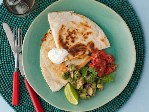 Lay the tortillas flat on a cookie sheet. Sprinkle some of the cheese on 1 half of each tortilla. Try not to get it too close to the edge. Fold the tortillas in half over the cheese to make a half-moon. Warm a skillet over low heat and add 1 tablespoon of the butter. Add the tortilla to the skillet and cook until it is lightly brown, about 2 minutes. Using a spatula, gently lift the edge so you can check. When 1 side is brown, turn the tortilla over and cook the other side until brown and the cheese is all gooey. Use a spatula to transfer to individual plates or a large platter. Repeat with remaining butter and tortillas. Top them with the sour cream, salsa and guacamole.
