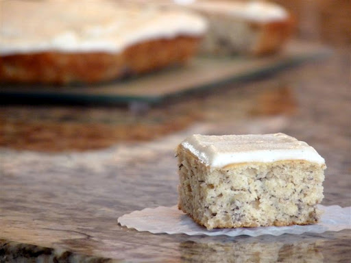 Preheat the oven to 375F (see note below). Cream together sugar, sour cream, egg, and 2 tablespoons softened butter. Add mashed bananas and 1 teaspoon vanilla extract. Add flour, salt, and baking soda; mix well. Pour into greased 8x8 pan. Bake at 375F for 20-25 minutes until a toothpick inserted in the center comes out clean. Cool completely before frosting.