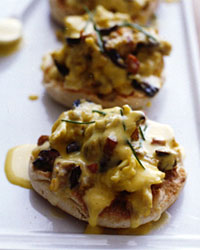 Arrange the toasted English muffins on 4 plates. Spoon the scrambled eggs on the muffins and top with the Classic Hollandaise Sauce. Garnish with the chives and serve right away.