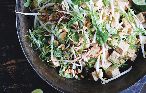 Spoon tofu over rice and top with charred and raw bean sprouts, scallions, peanuts, and mint. Serve with lime wedges.
