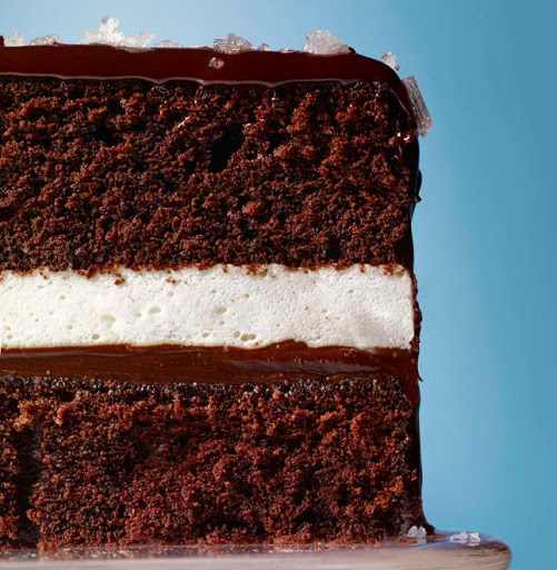 Spoon filling over chilled ganache on cake layer in pan; smooth top. Gently place second cake layer on top. Cover tightly with plastic wrap and chill until cream layer is set, at least 6 hours or overnight.