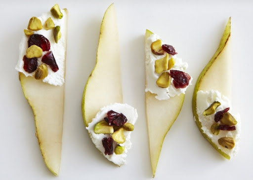 Core pears and cut into slices. Toss lemon juice to keep from browning. Spread cheese on widest part of slice and then shower cheese with cranberries and some pistachio pieces. Arrange on platter and serve.