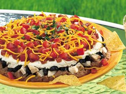 Mix and set aside: avocados, lemon juice, salt, pepper. Mix together sour cream, mayonnaise, Taco seasoning. Spread beans, top with avocado mix, cour cream, etc. Chill. Top with cheese just before you serve.