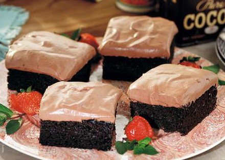 Sprinkle 1 teaspoon cocoa in bottom of prepared baking pan.