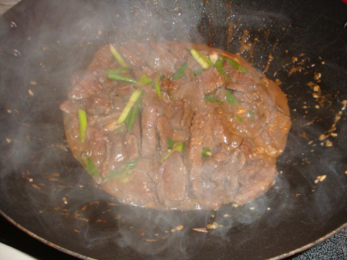 Heat up another 1 tablespoon of oil and saute the garlic and ginger until aromatic. Add the beef back into the wok and then the sauce. Continue to stir-fry until the beef slices are almost done, then add the leeks/scallions into the wok. Do a few quick stirs, add salt to taste, dish out and serve hot.