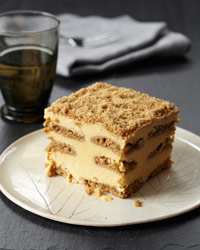 Pumpkin pie meets tiramisù, with layers of pumpkin-mascarpone custard and gingersnaps brushed with Calvados syrup. In the freezer, the flavors and textures meld to form a deliciously creamy dessert.