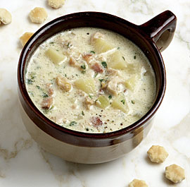Creamy, hearty New England clam chowder is by far the most popular chowder style (compared to Manhattan or Rhode Island versions). Chowder made with milk or cream began appearing in the early 1800s, and New Englanders claimed it as their own in the 1900s. Many versions use a flour and butter roux to thicken the soup. The roux is necessary if you’re cooking with milk; otherwise, it curdles when boiled. This chowder gets its thick texture from a combination of heavy cream and puréed potatoes. You can crush some of the potatoes against the side of the pot (instead of puréeing the vegetables) for a thinner but equally delicious version.