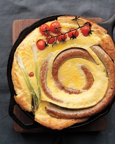 The skillet of sausage, scallions, and tomatoes surrounded by oven-puffed savory pudding was inspired by English toad-in-the-hole.