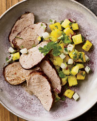 Light a grill or preheat a grill pan. Remove the pork from the marinade. Brush with the remaining 1 tablespoon of oil and season generously with salt. Grill the pork over moderately low heat, turning occasionally, until an instant-read thermometer reaches 135 when inserted in the center of the meat, about 20 minutes. Transfer the pork to a cutting board and let rest for 10 minutes. Slice the pork and serve with the salsa.