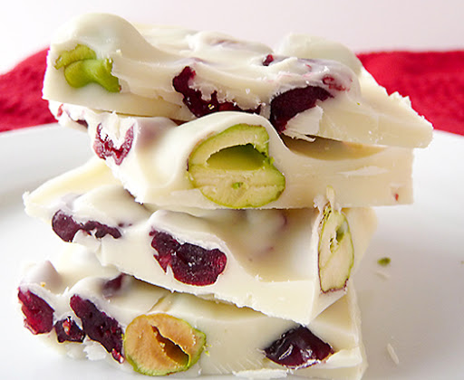 I love how festive the red cranberries and green pistachios are, and against the creamy white backdrop, this bark is a gorgeous addition to a cookie tray or even to put into individual tins or goodie bags for giving as gifts.