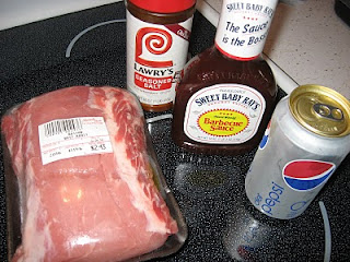 Generally coat pork butt with Lawry's seasoning salt, don't be afraid to cover it all! Place in crock pot and pour in soda and barbecue sauce. Cover and cook on low for 4-5 hours. If you have a larger piece of meat, it will probably take longer. After 4 hours or so, take two forks and shred the meat into bite size chunks. Let it sit in the juice to soak up all that flavor. It can stay on warm in crock pot while serving, and can easily be reheated the next day. Serve on a kaiser roll and add more barbecue sauce if needed.