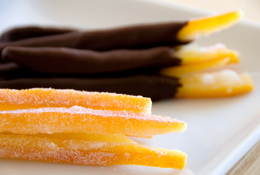 Cut peel into 1/4 inch strips. Place peels in a large saucepan and cover with cold water. Heat on high until water comes to a boil. Pour off the water. Repeat twice more. Combine sugar and water in the saucepan and bring to boil over high heat until temperature reaches 230F. Add peel and reduce heat to simmer. Simmer until peels are translucent (30 minutes or longer – 75 minutes at my 8500 ft. elevation). Remove peels from syrup and roll in sugar if desired, and set on rack to dry for 4-5 hours (well, I dry for 2 days and more humid regions will require more time). Once the peel is dry, you can dip in tempered dark chocolate – shake off excess, and place on foil, wax paper, or baking sheet to dry. Store in a tupperware, or if not chocolate dipped, store in sugar or as is.