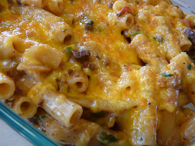 Once the pasta is cooked, drain it and add it back into the large pot. Add the contents of the hamburger and all of the Cheddar sauce, and stir to combine. Transfer to a baking dish, sprinkle with a bit more cheese if you wish, and place under the broiler to lightly brown.