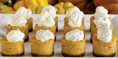 In the bowl of an electric mixer fitted with the flat paddle and set on low speed, beat together the cream cheese and sugar until smooth, 3 to 5 minutes. Add the eggs one at a time, beating well after each addition, and then beat in the vanilla. Add the pumpkin mixture and beat until completely blended, about 1 minute. Pour the batter into the crusts, dividing it evenly among the pans.
