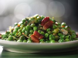Per Michael Symon: I make this dish when peas are at the height of their season and I love to serve it with simply cooked fish, such as grilled halibut or grilled salmon. It needs some acidity because of the richness of the bacon and rendered fat. Since I don't love lemon and bacon together, I opt for orange juice and zest; the brightness they add works perfectly here.