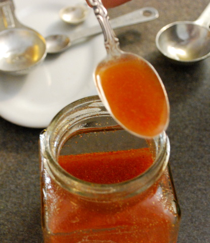 Dissolve cayenne and ginger in cider vinegar and water. Add honey and shake well. Take 1 Tablespoon as needed for cough. Hoo-wee.